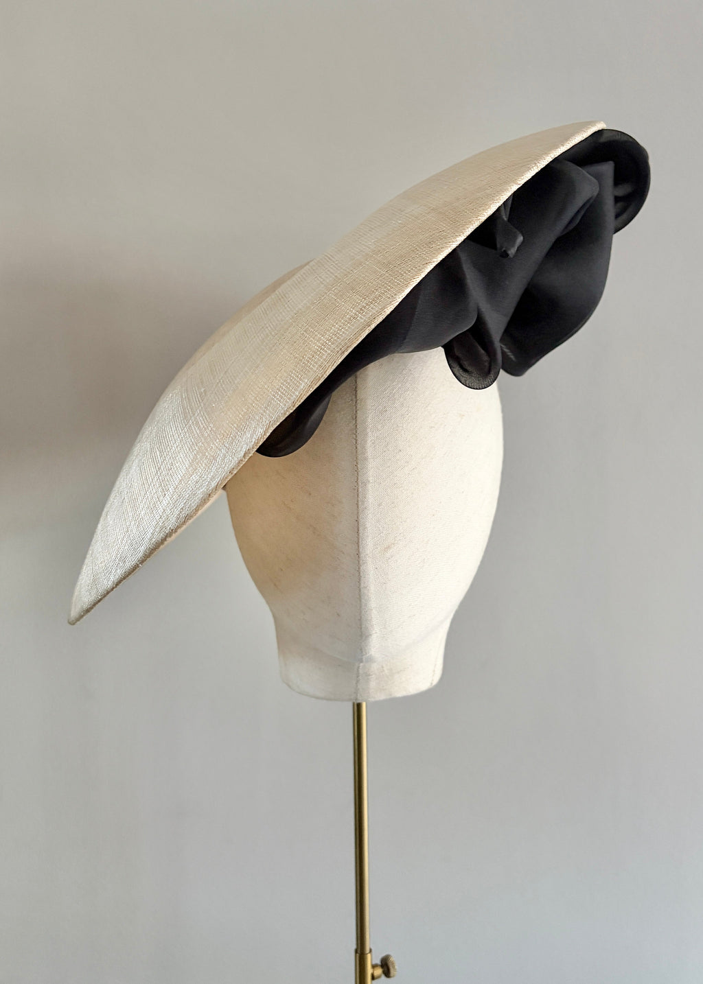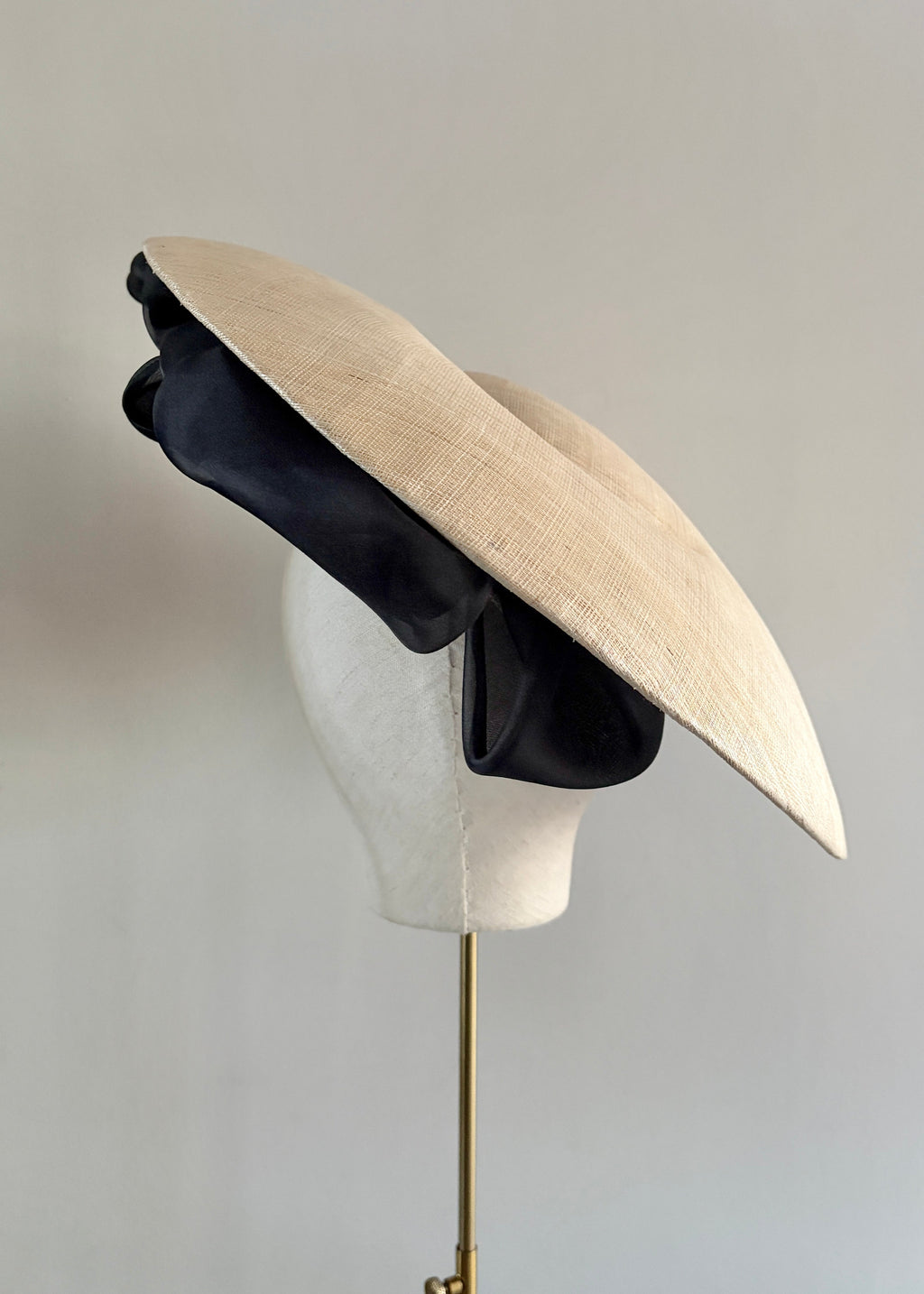 A beautifully crafted piece made from luxurious pinokpok straw blended with fine silk. The understated silhouette is finished with a sculptural Italian organza waves placed beneath the brim, adding a touch of unexpected sophistication.