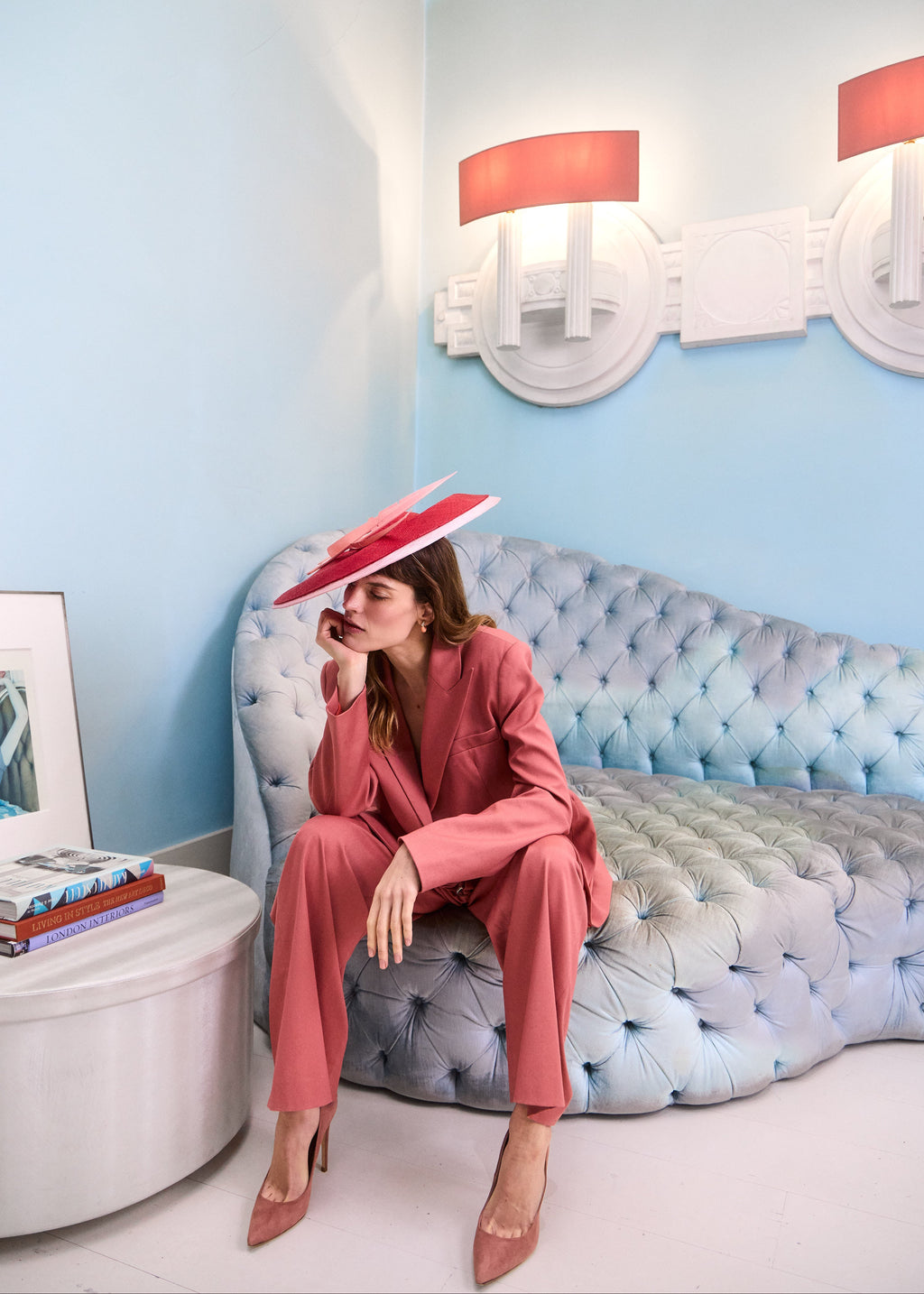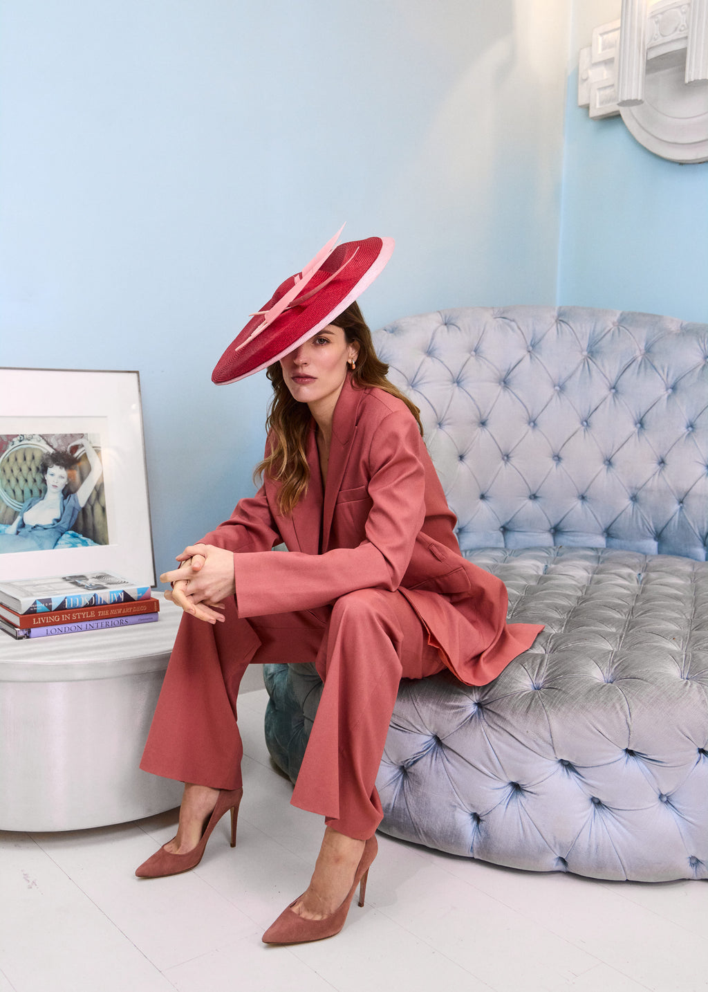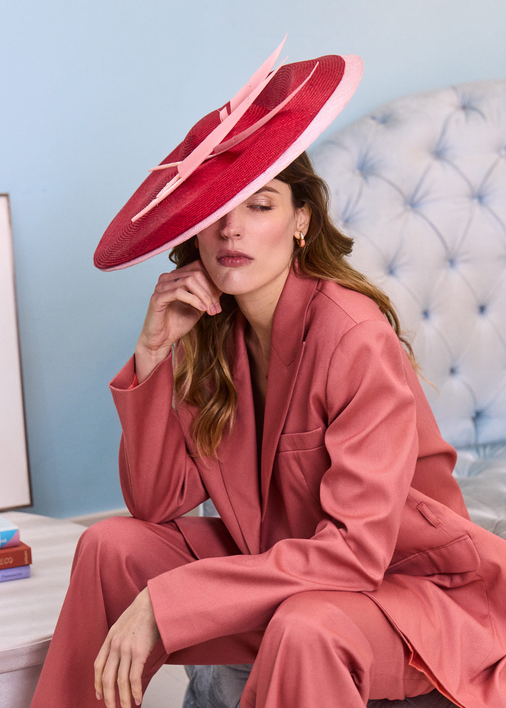 A striking two-tone occasion hat crafted from fine straw and sinamay, creating a beautifully balanced contrast in colour and texture. Trimmed with two elegant feathers for added height and movement, this sculptural design delivers confident, modern sophistication. Hand blocked in our London atelier, this designer headpiece is secured with a discreet hair-coloured elastic and comb for a comfortable, seamless fit — perfect for race days, weddings, and elevated summer events.