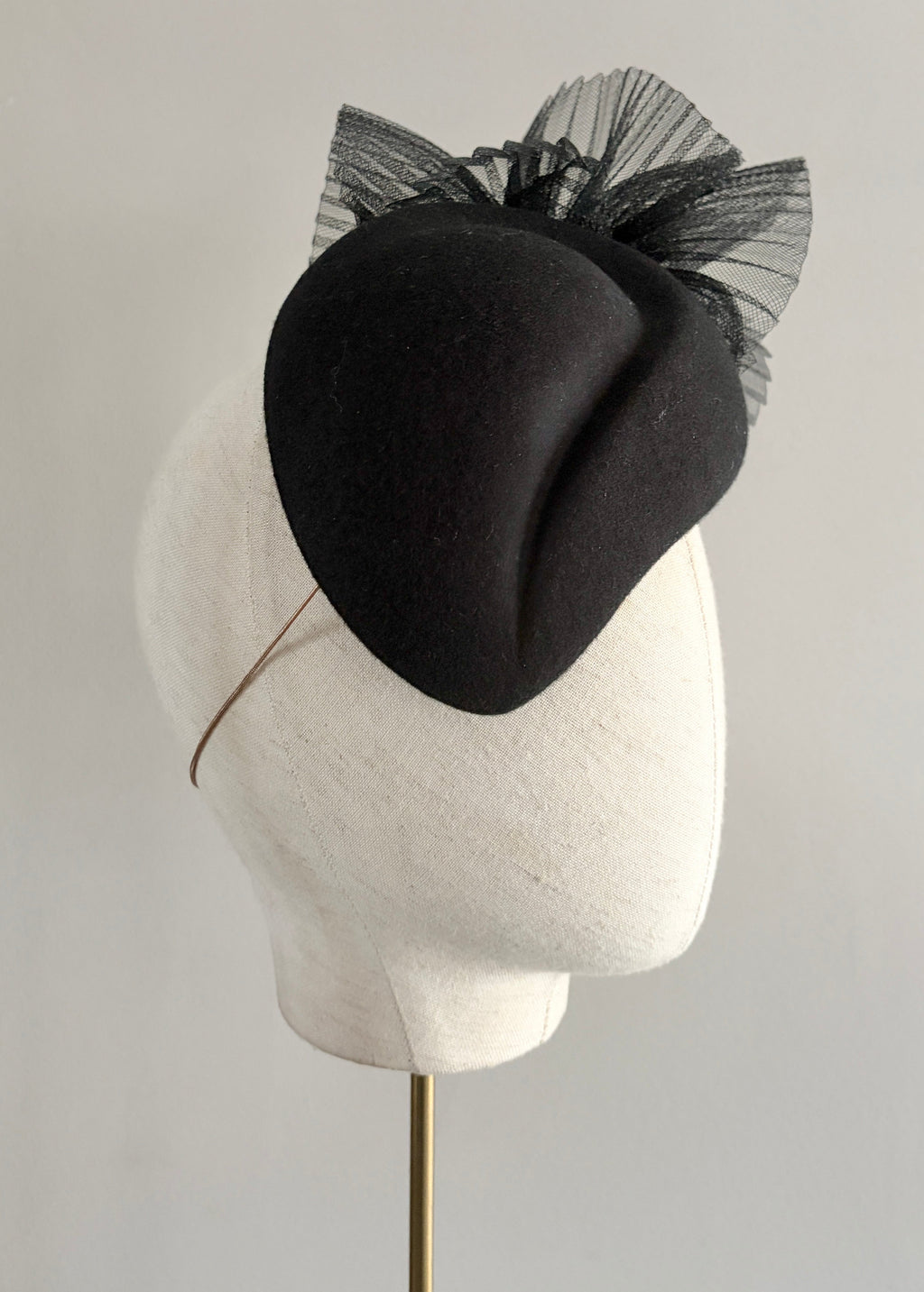 A beautifully refined cocktail hat crafted from premium wool felt and finished with elegant pleated crin detailing. Designed to sit gracefully at the front of the head, it adds structure and sophistication to any winter look. Secured with a discreet hair-coloured elastic, it pairs perfectly with both updos and loose hairstyles.