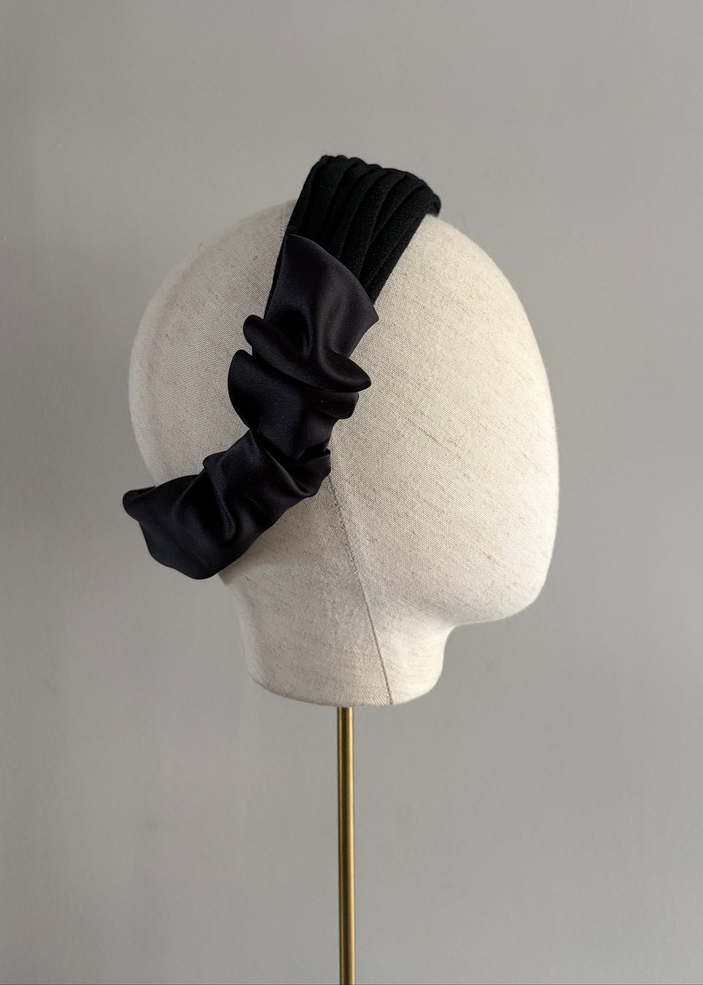 Always stylish, this diamond crepe pleated band is an impeccable piece for so many special occasions. Neatly pleated crepe that has been handcrafted, along with a unique scrunchie esque bow detail at the back, ensure that this will be a firm favourite for years to come.