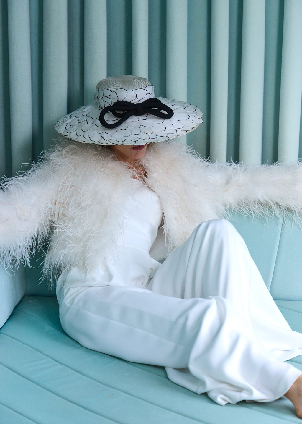 This extra-large, slightly downturned brimmed boater is a striking statement piece. Crafted from fine straw, hand-dyed in a soft blush hue and trimmed with a luxurious Italian satin bow, it exudes elegance and sophistication. The hat perches gracefully on the head and is secured with a discreet, hair-coloured elastic for a comfortable and seamless fit. Perfect for pairing with tailored suits or full skirts, it creates a beautifully defined silhouette that accentuates the waist with timeless style.
