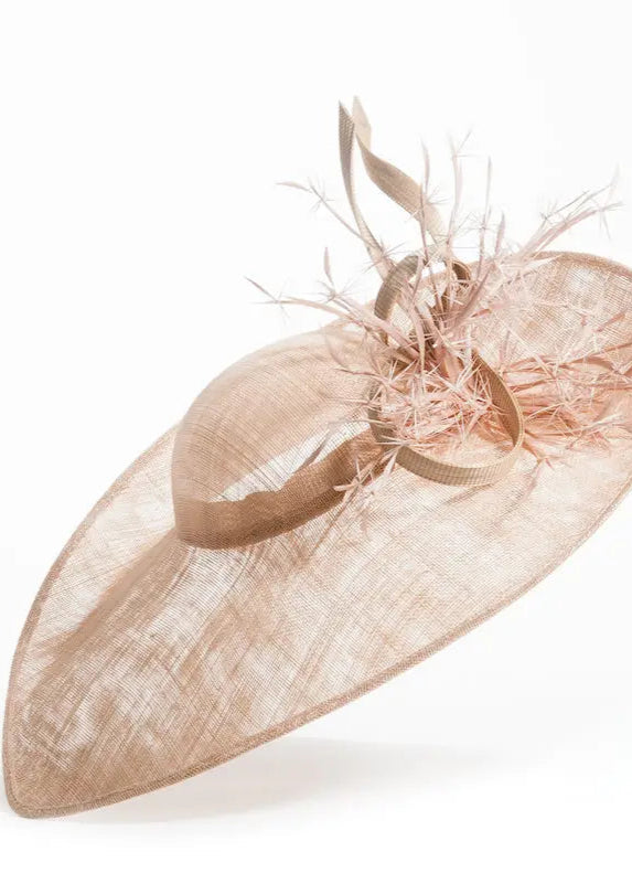 A captivating and sculptural headpiece, crafted from fine sinamay and adorned with hand-shaped buntal twists and luxurious goose feathers. This dramatic yet elegant design offers a bold silhouette while remaining lightweight and easy to wear. Secured on a discreet headband for comfort and confident styling.