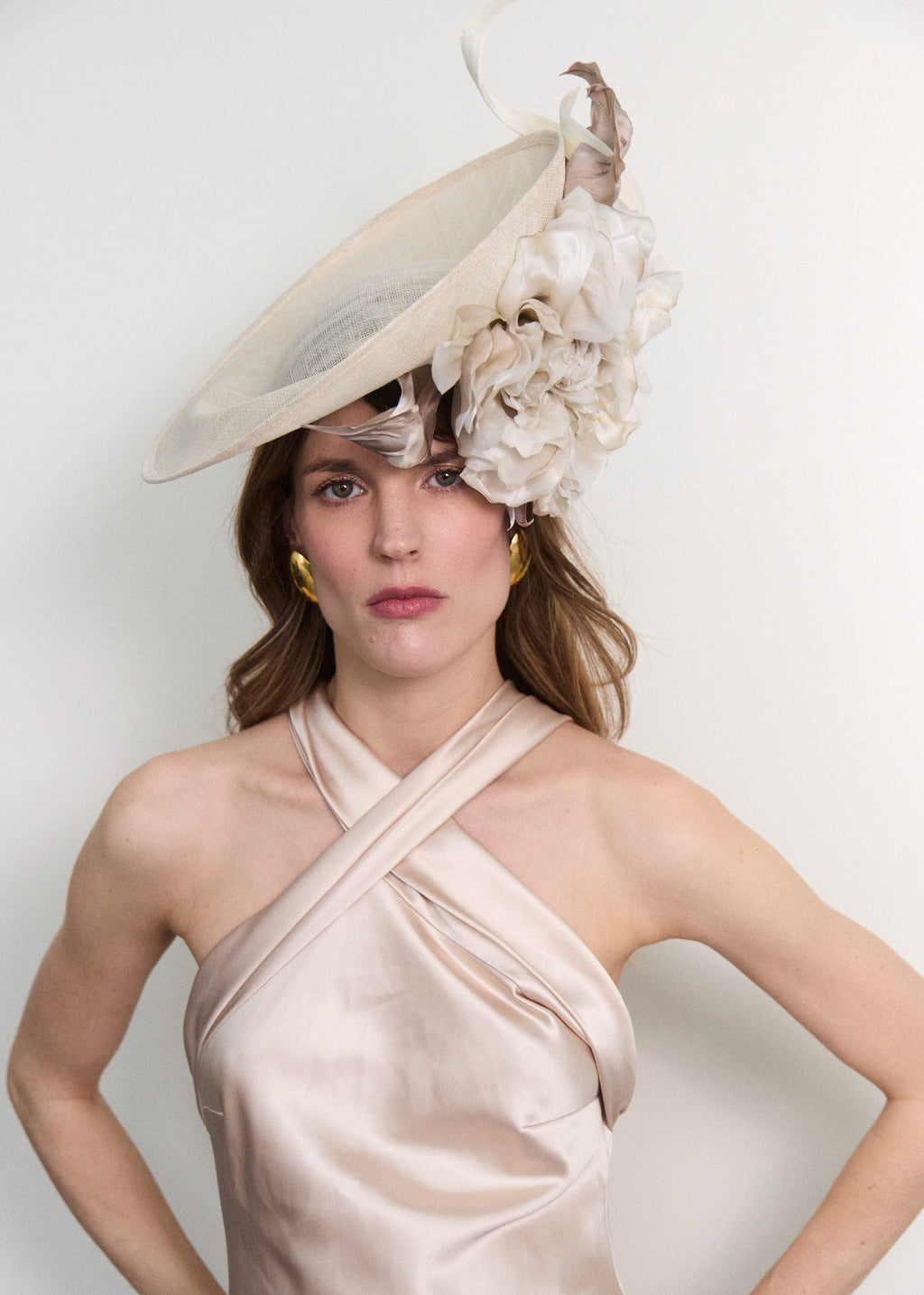 A striking sculptural disc headpiece created to command attention. Expertly handcrafted in fine sinamay, it showcases dramatic hand-dyed buntal twists and a delicately handmade flower at its centre, adding texture, movement, and depth to the design. Set on a discreet headband with a hair-coloured elastic for a secure and comfortable fit, the Lilaya offers a refined blend of artistic millinery and modern sophistication.