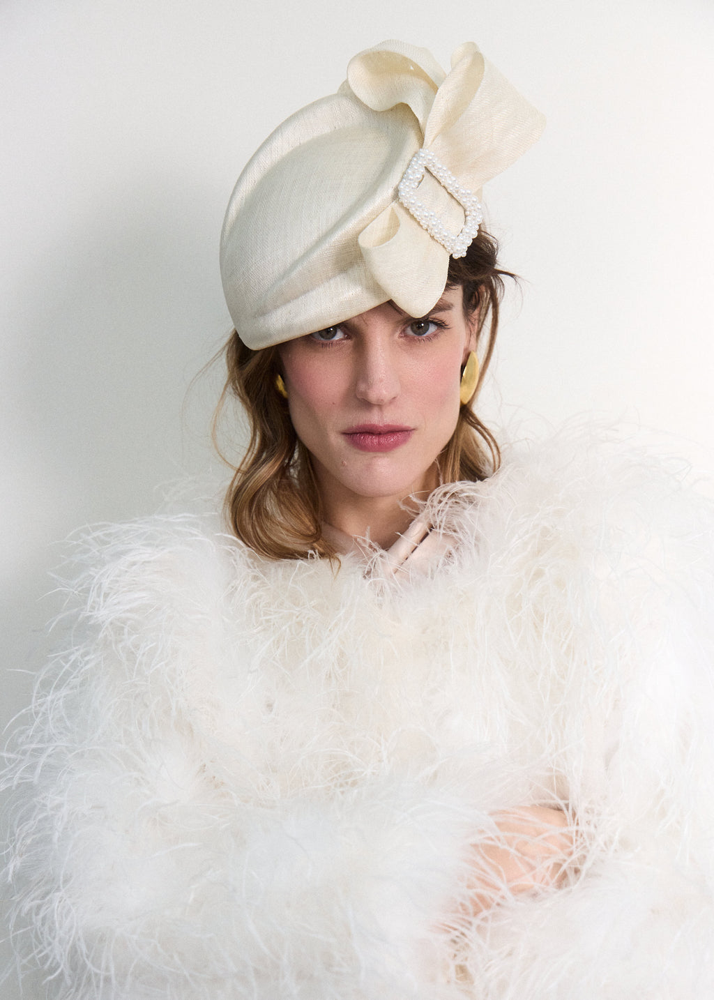 Refined and sculptural, this designer occasion hat is crafted from luxurious pinokpok and features a beautifully formed bow, artfully finished with a pearl buckle at its centre. Blending contemporary millinery with elegant detailing, it offers a polished and distinctive silhouette. A versatile choice for race days, weddings, and special occasions, it is also perfectly suited as a modern bridal headpiece. Secured with a comb and discreet, hair-coloured elastic, it ensures a flawless and comfortable fit from day to evening.