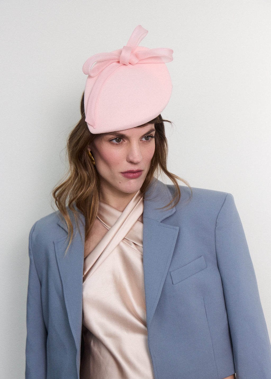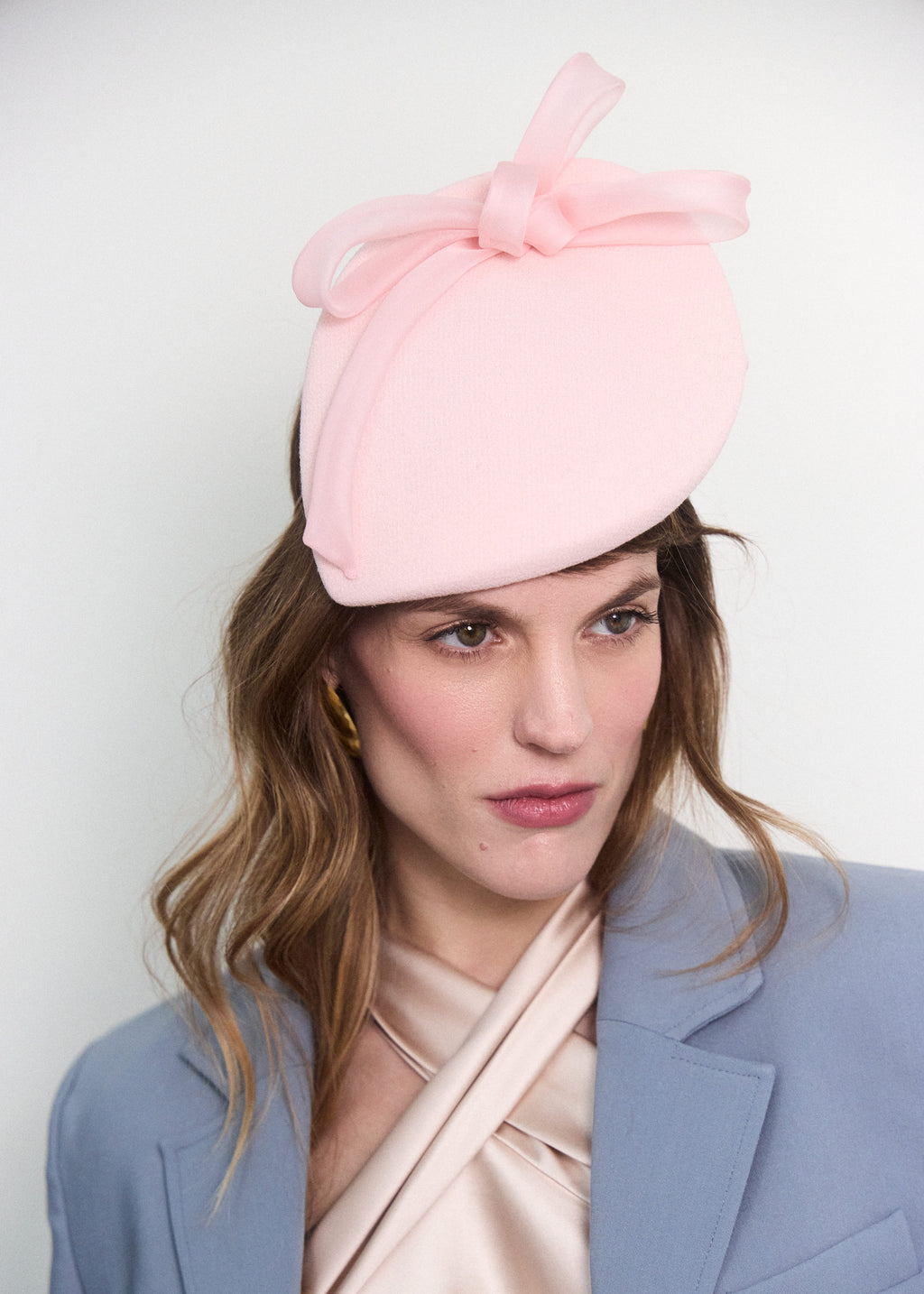 Graceful and timeless, a beautifully shaped teardrop cocktail design crafted from luxurious Italian double crepe. Finished with a delicate organza bow, this hat effortlessly blends classic elegance with feminine charm. Secured with a comb and an hair-coloured elastic for all day comfort.