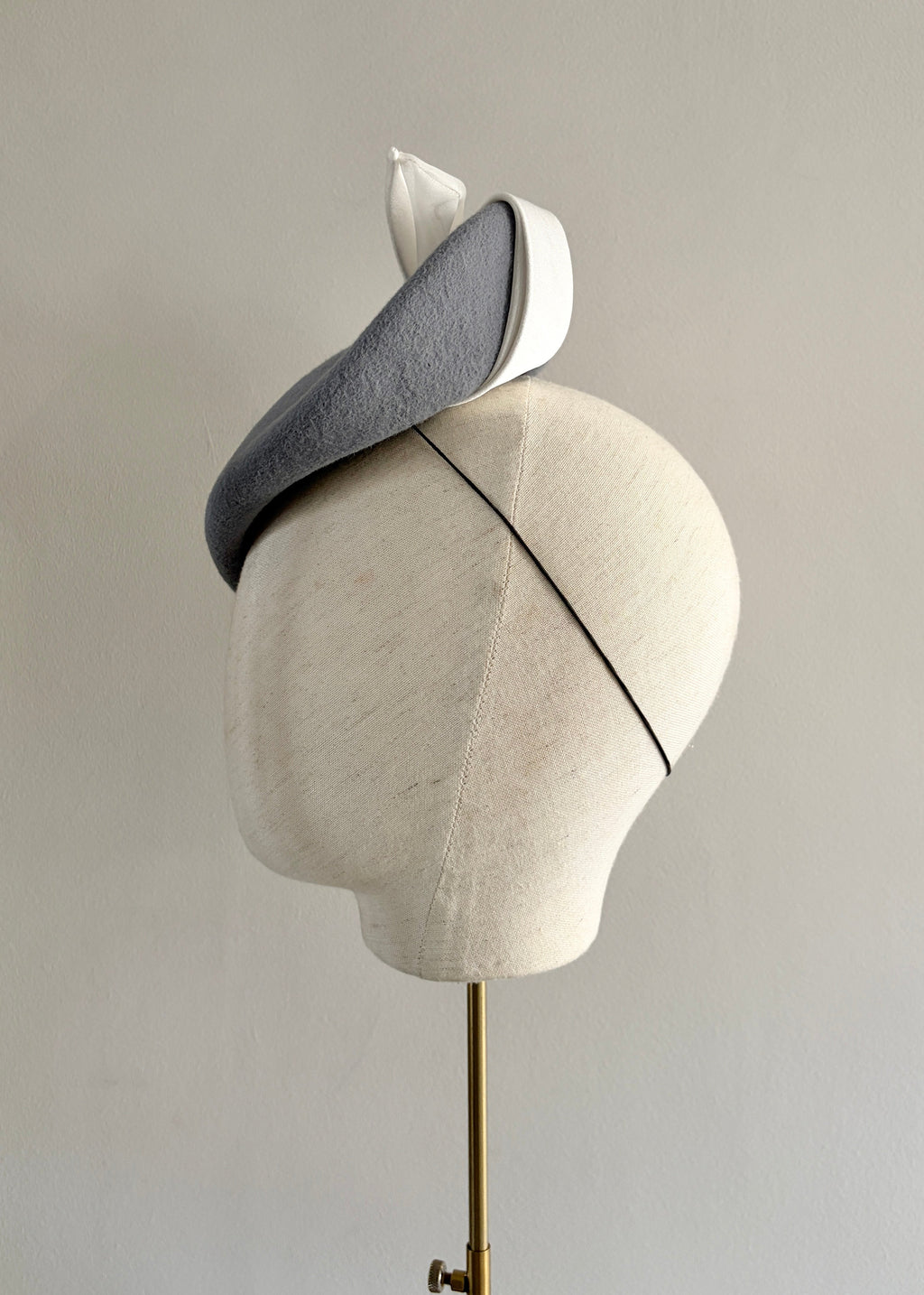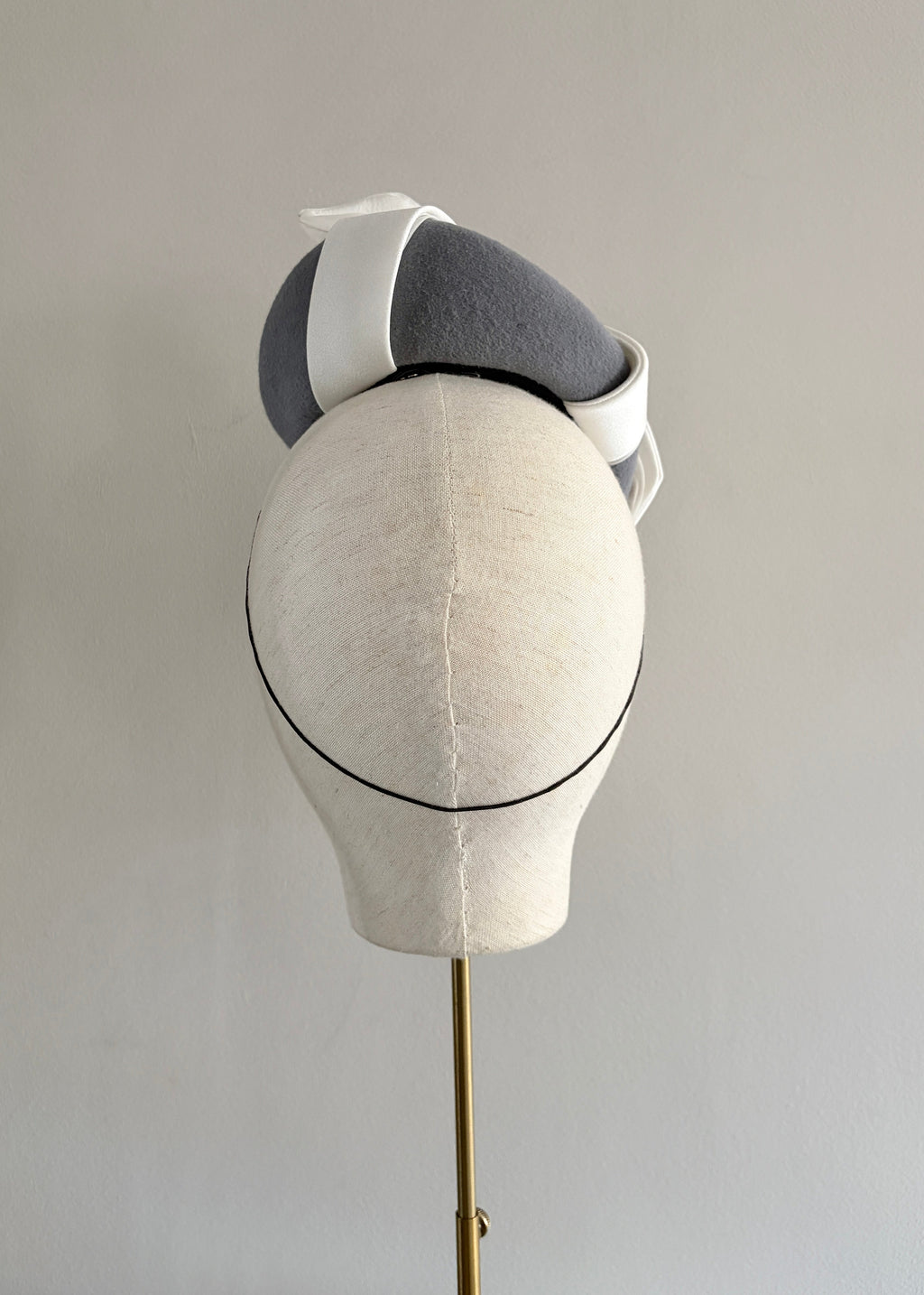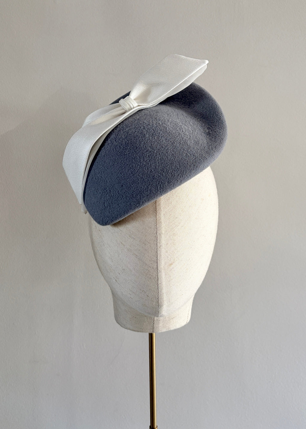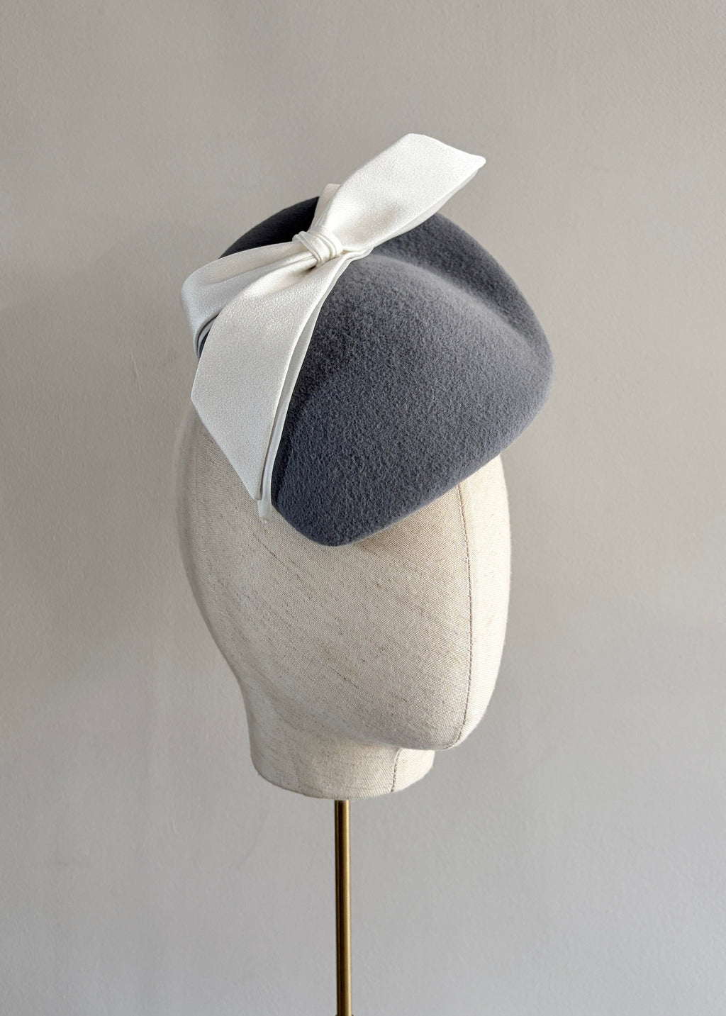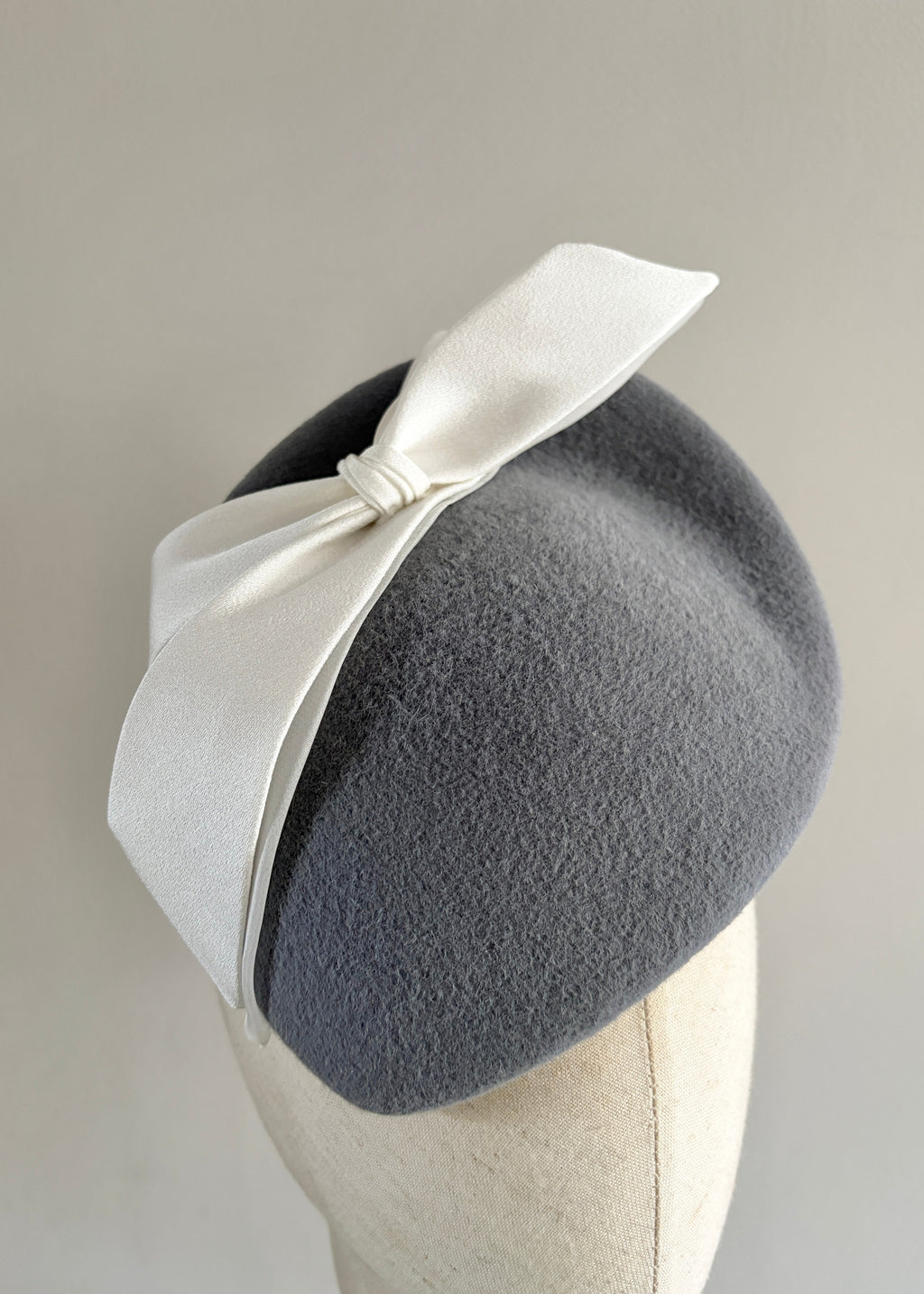 A refined and sculptural felt occasion hat, elegantly finished with a tailored ivory bow crafted from luxurious satin and delicate organza. The interplay of textures creates a beautifully balanced silhouette, combining softness with modern millinery structure. Perfect for weddings, race days, and formal occasions, this sophisticated design offers timeless elegance with a contemporary twist. Secured with a discreet comb and hair-coloured elastic for a comfortable and seamless fit.