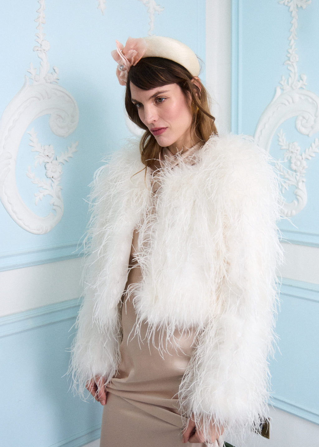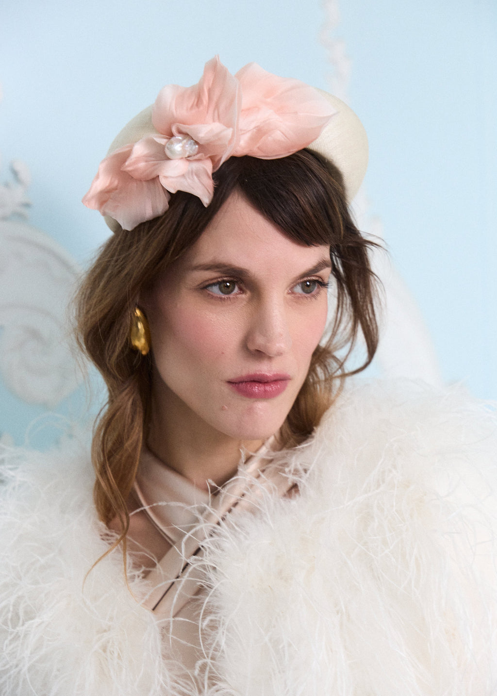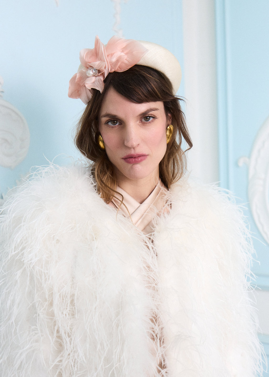 A sculptural interpretation of our signature silhouette, crafted from fine pinokpok for a beautifully textured finish. Adorned with hand-painted bougainvillea petals and a luminous baroque pearl, it creates a striking balance of artistry and organic elegance. This distinctive designer piece brings refined drama to special occasions and summer events, and could also be styled beautifully as a bridal headpiece. Secured with a discreet hair-coloured elastic for a seamless and comfortable fit.